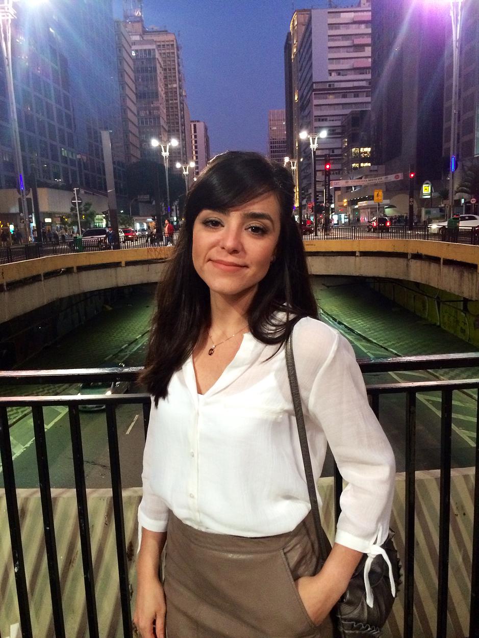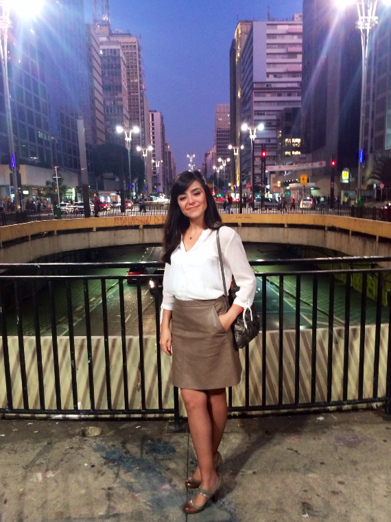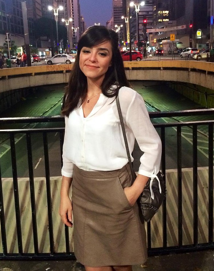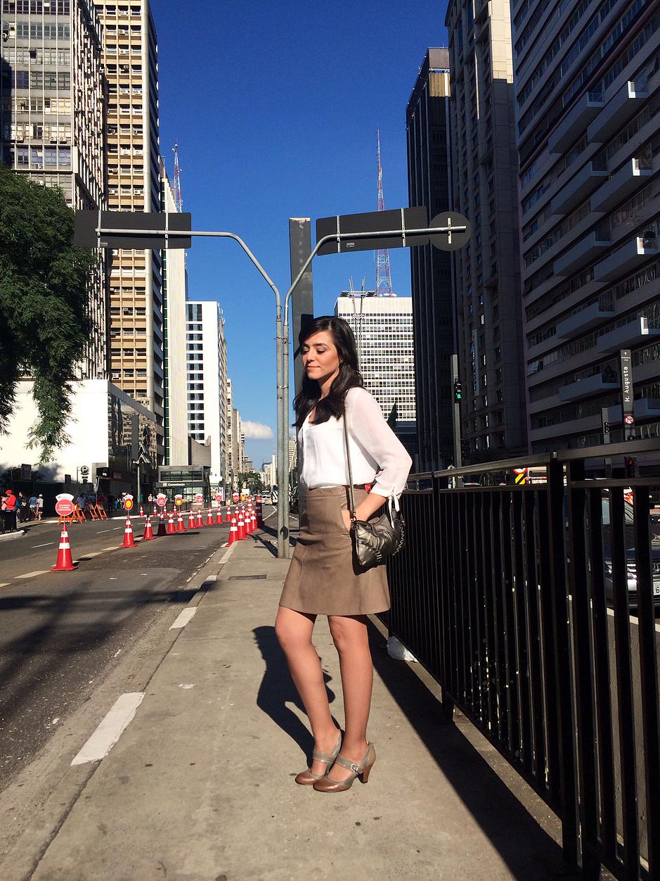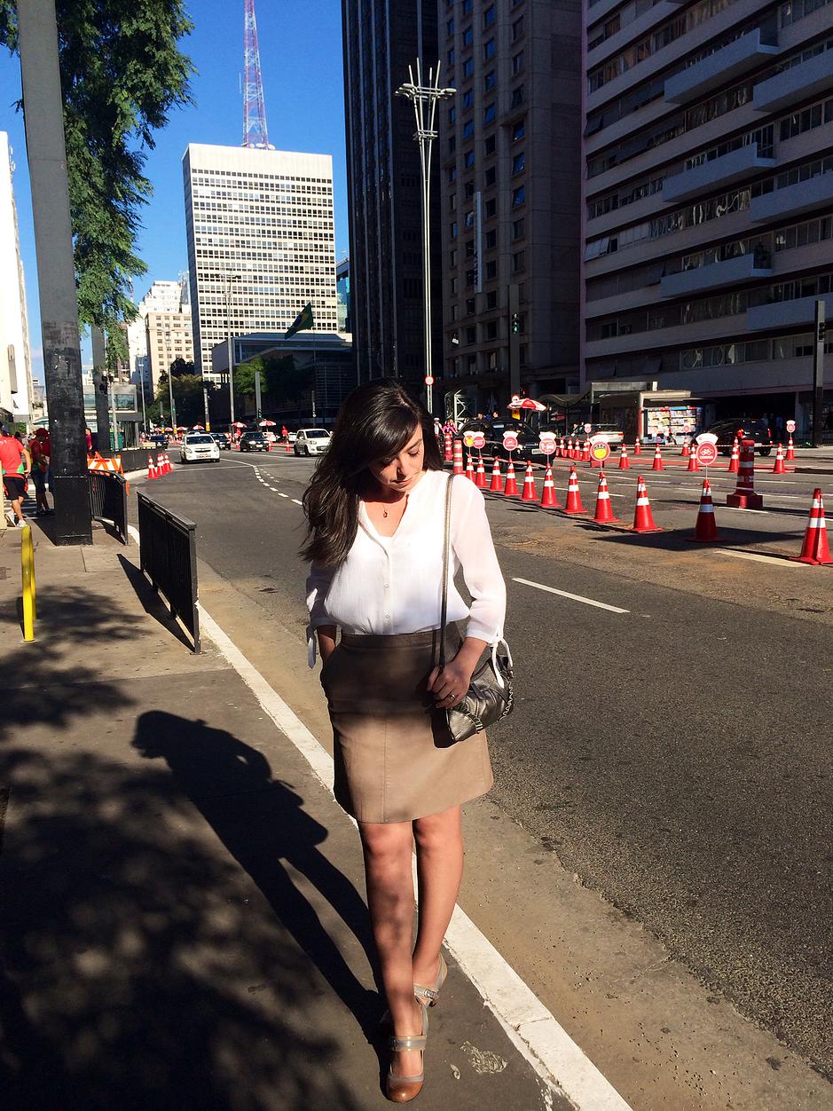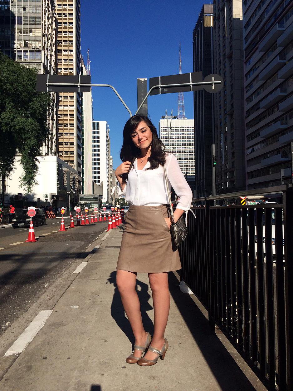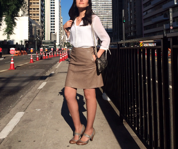 Optei por usar uma saia de couro com meia calça (estava sol, porém friozinho), camisa delicada e sapato mais pesado para contrabalancear e combinar com o couro.