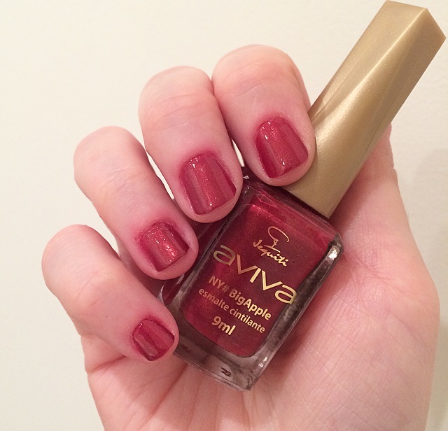 – Cor NY Big Apple (cintilante): sabe cor de maçã do amor? É a cor dele! Vermelho mais fechado com partículas cintilantes, lindo. Uma camada já cobre bem, mas passei duas na foto.