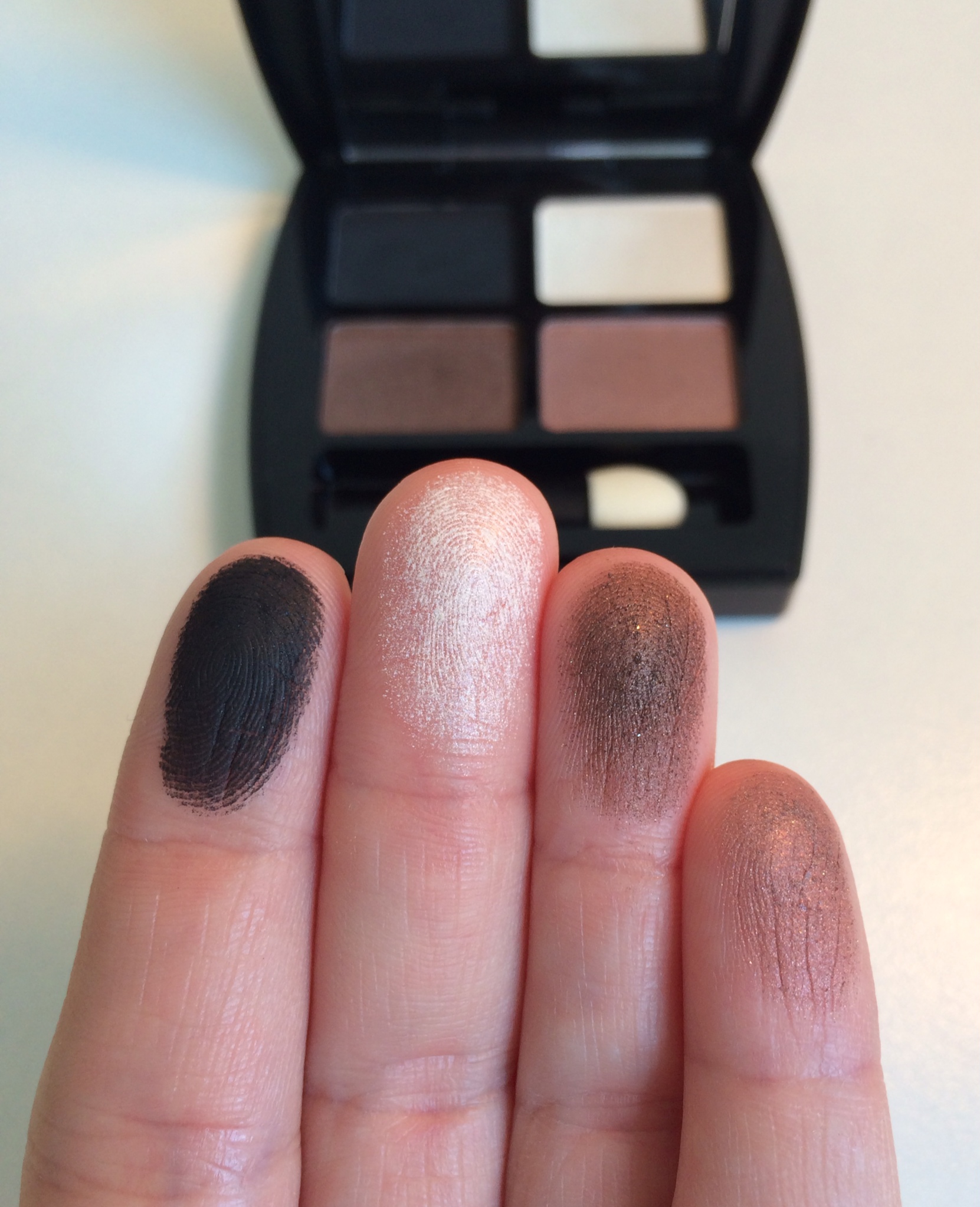 A escolha das cores foi bem feliz: preto, marrom, rosé acobreado e branquinho. Essa combinação é suficiente para fazer um olho completo.